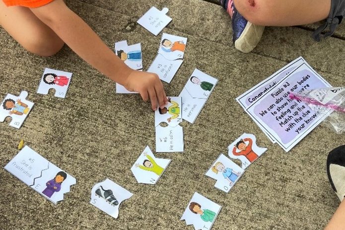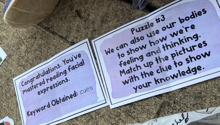 The older students also played a breakout box game with the treasure chest, this one focusing more on pragmatics and social language skills. The students had to work together to find 5 baggies that were hidden around the playground. Once they used their communication skills to work together to locate the baggies, they had to complete challenges that were inside the baggies to earn the key to unlock the treasure box. Each challenge presented the opportunity to practice recognizing and applying social language skills like facial expressions and tone of voice. One of the challenges had students role play scenarios where the same sentence could present different meanings based on which word was stressed. For example, the utterance “I didn’t SAY you stole the money,” communicates something different than “I didn’t say YOU stole the money.” Another challenge involved matching a written emotion to picture representations of the physical look of an emotion, as shown in the picture above. Body language and tone of voice provide ample amounts of crucial communicative information. The students are learning how expressive and receptive tools like these can extend their communicative superpowers beyond the word level!