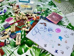 When Mrs. O is not working with the students at the Superhero Summer Camp, she can still be found on the WonderBus doing individual speech therapy. On this particular day, Mrs. O worked with a student on his articulation using stamps! Articulation is the ability to adjust the structures of the mouth—like the tongue, lips, and teeth—into the proper shape to make a speech sound. The student has some trouble with strident sounds in continuous speech, meaning he can properly say the sounds in a word on its own, but the sound becomes a little wonky when linked in a string of words like in a sentence or in conversation. In English, strident sounds include s, z, f, v, ch and sh. Mrs. O had a whole bucket of stamps picked out to include these types of sounds in a natural play setting. As the student sorted through the stamps and chose the ones he wanted to use, Mrs. O would prompt him to practice articulating the sounds by asking him to name each stamp he used. The student had a blast making up stories about dinosaurs, snakes, fish, and beaches to go along with the pictures he had created with the stamps. Activities that allow students to use their creativity to drive the speech session produce wonderful opportunities for practice that doesn’t feel like work to the student. As we all know, practice makes perfect!