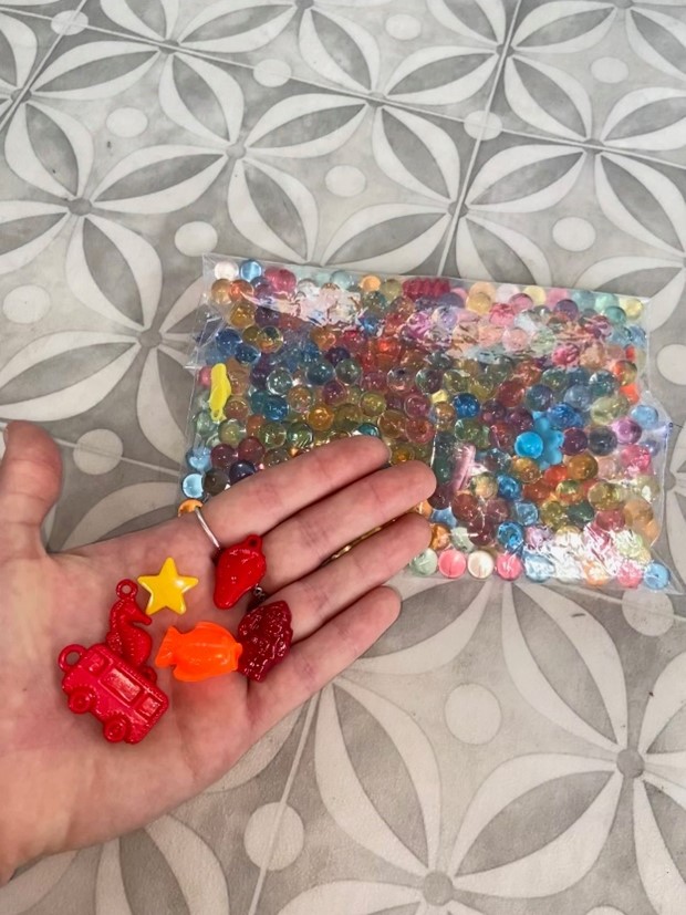 In order to get the student to focus on the proper articulation of her s and sh sounds, Mrs. O hid some toys in a bag of Orbeez® and had her name the goodies she was finding. Some of the toys in the bag were a school bus, strawberry, star, fish, seahorse, and Santa. Notice that the s and sh sounds are in all sorts of locations in these words. This particular student exhibits strident deletion in the beginning, middle, and end of words, so it is best to practice all locations she has trouble with. In some situations, an SLP may chose to focus on one location at a time. However, this student was super eager for her session, so Mrs. O was able to take advantage of her energy and multitask. I don’t know what the student found more fun, finding the toys or feeling all the squishy Orbeez®!